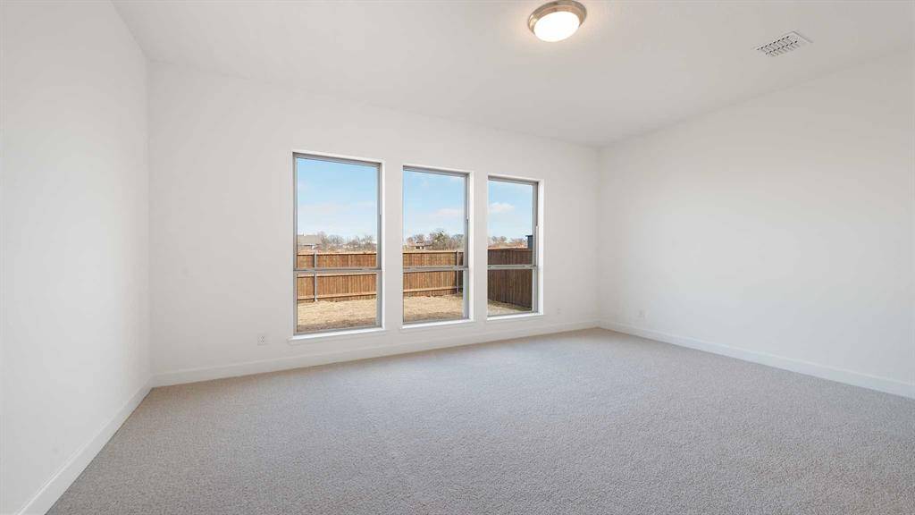 Home office with French doors set at two-story entry. Dining area opens to kitchen and adjacent two-story family room. Kitchen features walk-in pantry, a 5-burner gas cooktop and generous island with built-in seating space. Family room features a wood mantel fireplace and wall of windows. First-floor primary suite includes primary bath with dual vanity, garden tub, separate glass-enclosed shower and two walk-in closets. An additional bedroom is downstairs. A game room and two secondary bedrooms are upstairs. Covered backyard patio. Mud room off two-car garage.