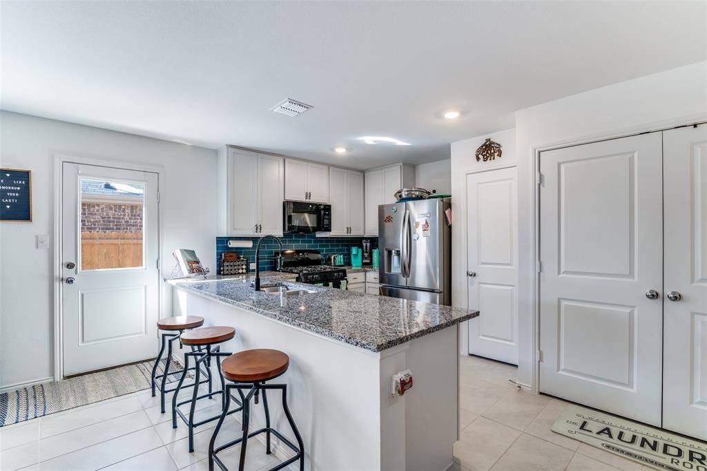 The kitchen features beautiful granite countertops, abundant cabinetry with attractive hardware, a walk-in pantry, gas range and oven, custom backsplash, and a breakfast bar for additional seating. A separate laundry room connects directly to the kitchen and includes extra storage space.