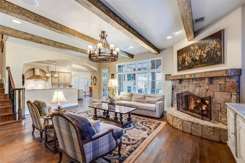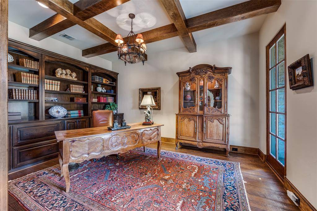 The living room has a beamed decorated ceiling that flows seamlessly into an elegant, large open kitchen. A formal dining room comfortably seating ten, an office, and a powder room are also located on the main floor.