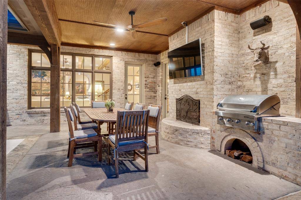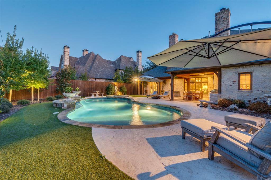 Step outside to the backyard featuring a covered outdoor living area that includes fireplace, dining space, and outdoor TV. Added in 2022, a large heated pool with a raised stone circular spa, a putting green and manicured low maintenance landscaping bring the final touch to this beautiful outdoor retreat.