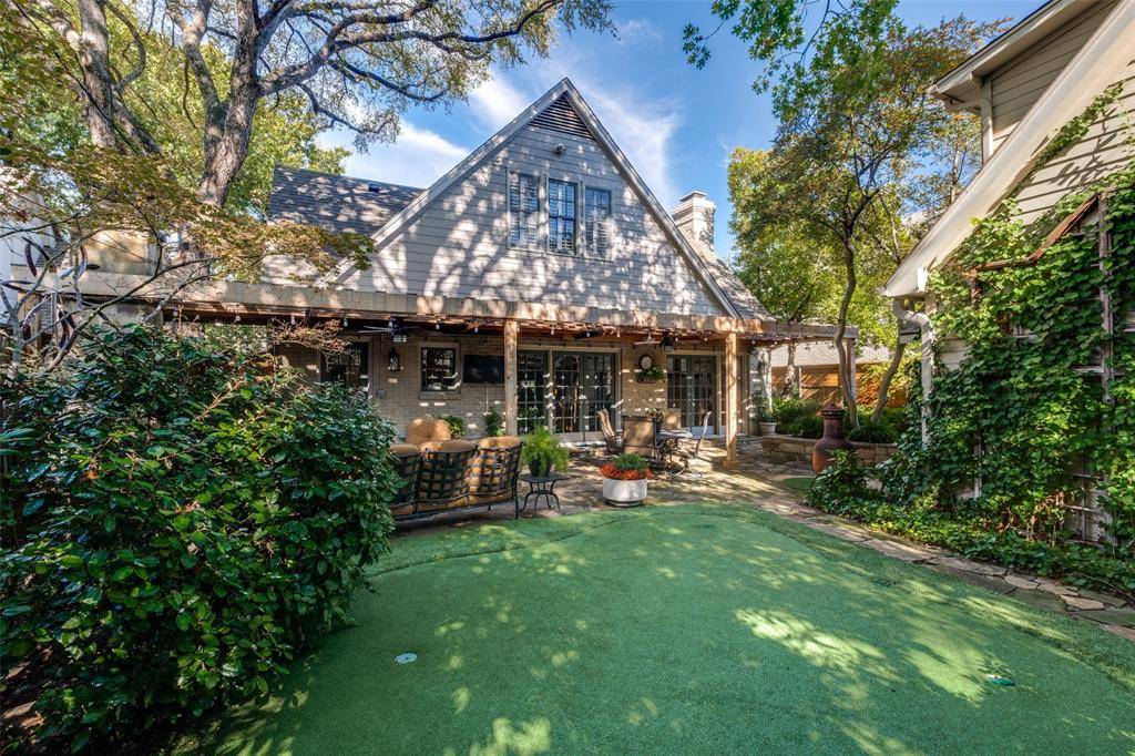 Step outside to discover a beautifully landscaped private backyard, complete with lush turf and a putting green. An outdoor seating area is perfect for gatherings, featuring a built-in grill and fireplace, all sheltered by a new pergola, creating an oasis for relaxation and enjoyment.