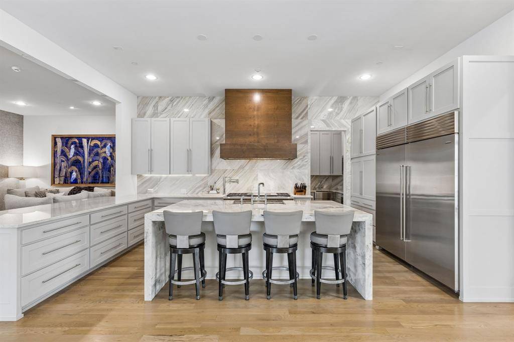 The chef's kitchen is a true showstopper, outfitted with premium Sub-Zero and Wolf appliances and complemented by a well-appointed butler's pantry providing additional storage and prep space.