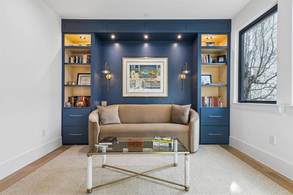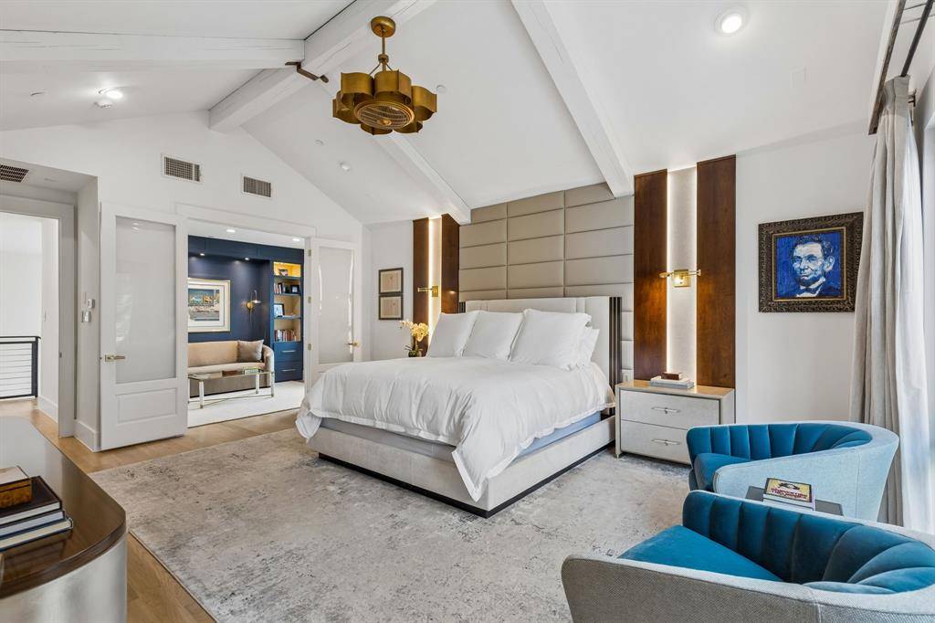 The luxurious primary suite offers a peaceful retreat with a cozy sitting area and custom built-ins. The spa-like primary bath and expansive custom closet feature beautiful woodwork and high-end cabinetry.